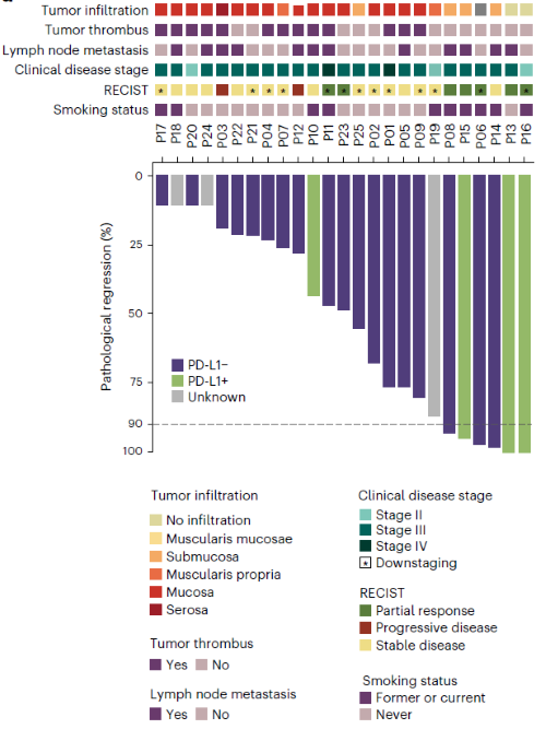 本研究探索了疗效预测的生物标志物、治疗期间肿瘤微环境的变化与病理退缩的相关性。发现治疗反应良好的人群在基线时呈现免疫富集的肿瘤微环境表型,而治疗反应差的人群多呈现成纤维细胞富集型;且肿瘤内T细胞克隆动态变化可用于识别治疗反应良好的人群。