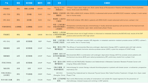 在胸腺上皮肿瘤、头颈鳞癌、肉瘤、前列腺癌、甲状腺癌等其他多个疾病领域,卡瑞利珠单抗、阿帕替尼、瑞维鲁胺、阿得贝利单抗、法米替尼、HRS-7058、HRS-4642、HRS-5041等抗肿瘤创新药相关研究一共入选了4项口头报告、1项简短口头报告、5项壁报,彰显了AG视讯医药强大的研发实力。此外,海曲泊帕和昂丹司琼口溶膜分别在防治化疗导致的血小板减少和恶心呕吐方面各有1项研究入选壁报。